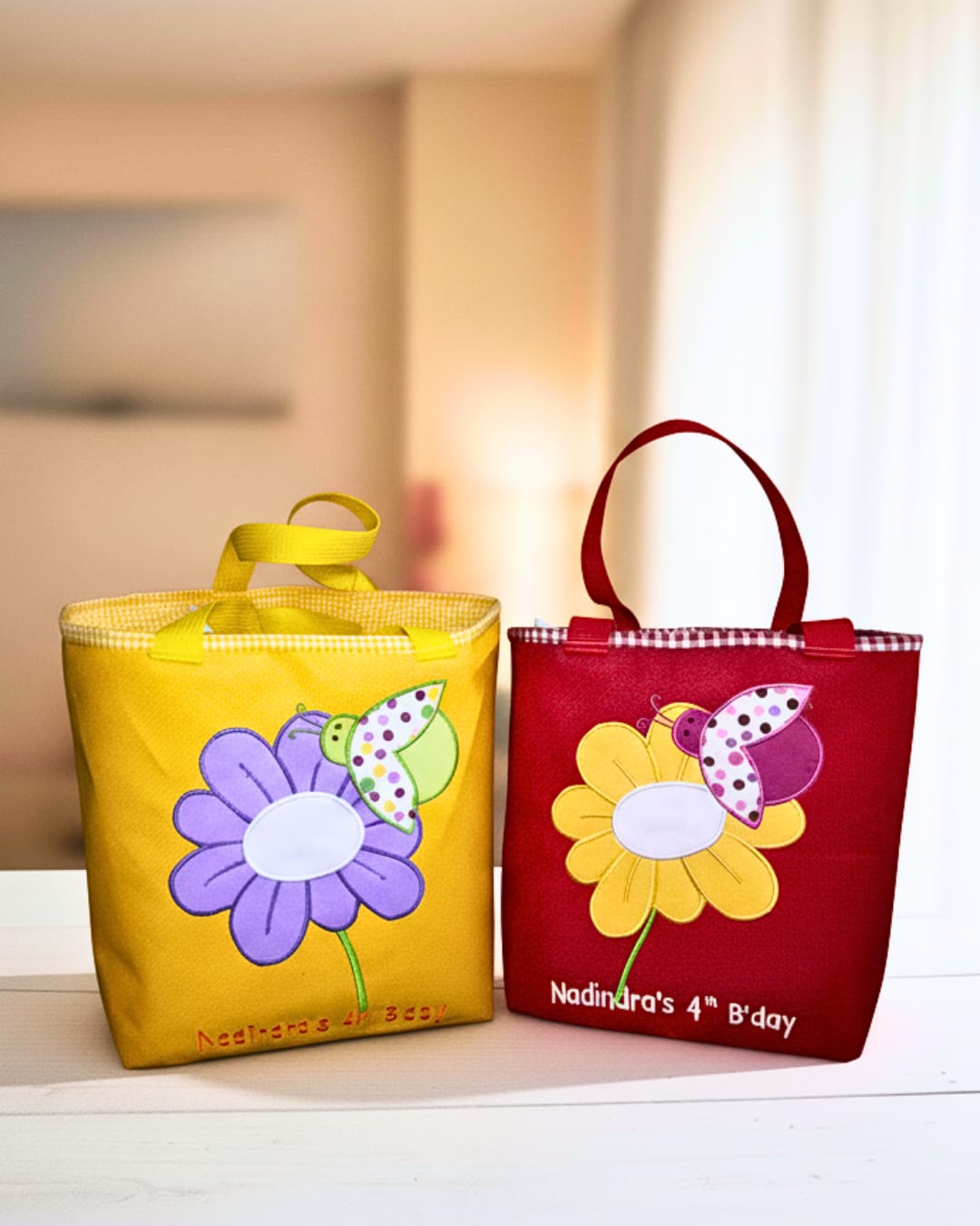 Personalisasi Penuh: Anda bebas request warna tas dan gambar aplikasi sesuai dengan tema pesta Anda. Lihat betapa cerianya kombinasi Merah-Lebah, Kuning-Bunga, atau Hijau-Ulat!