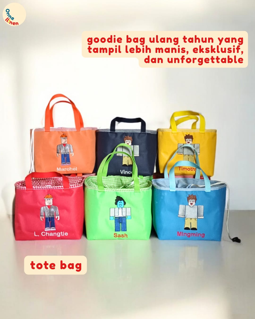 Tidak tanggung-tanggung, kami menghadirkan 6 karakter Roblox berbeda dalam 6 warna tas yang cerah dan bisa disesuaikan dengan permintaan Anda. Agar semakin spesial, setiap tas bisa diberi nama secara custom, memberikan kesan personal yang mendalam bagi si pemilik.