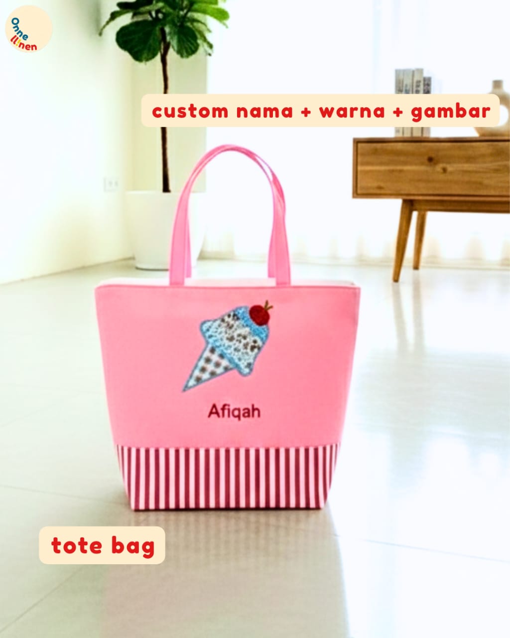 Fitur Custom: Gambar Aplikasi, Warna Tas, dan Nama Anak.