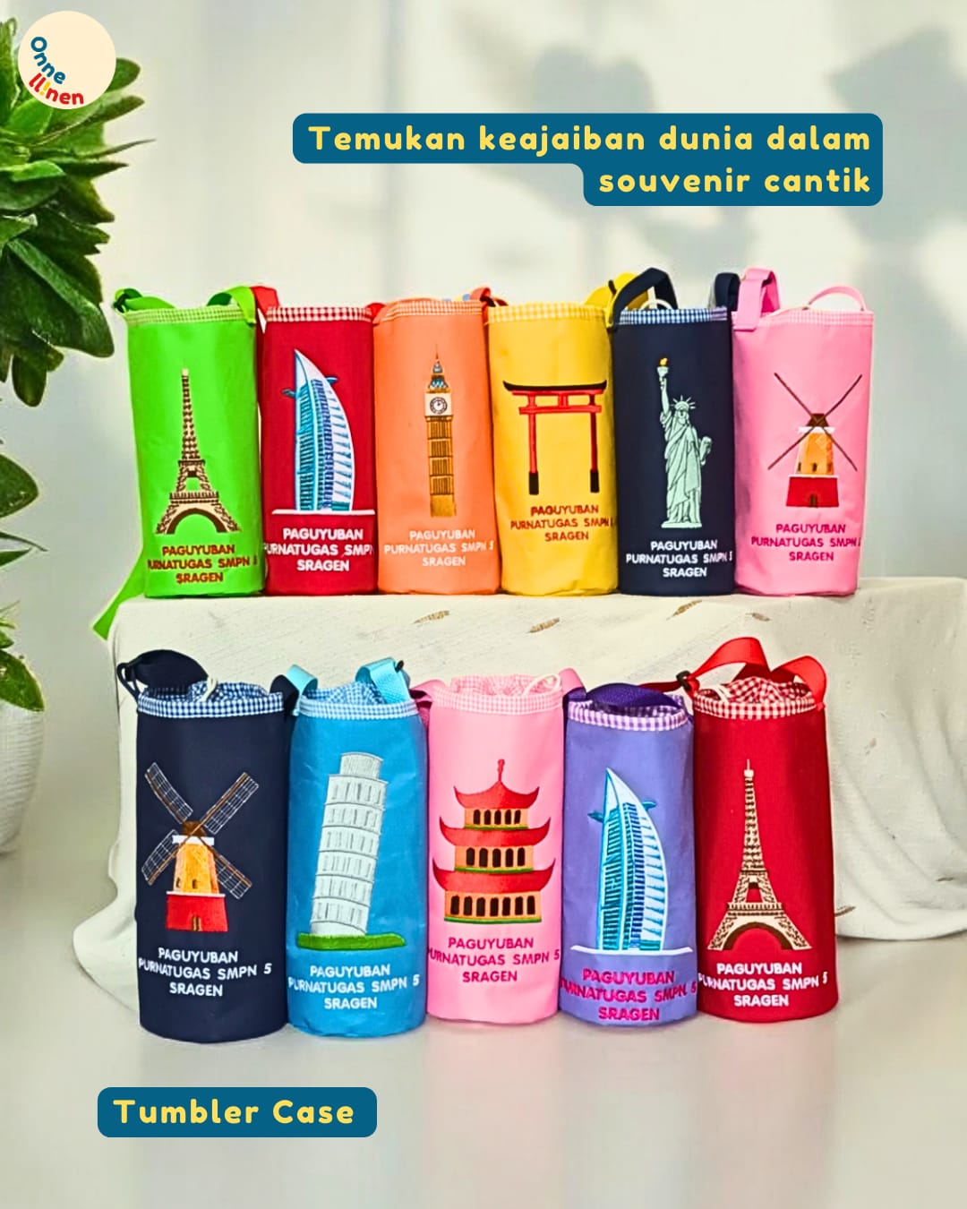 Tumbler Bag tema Landmark Dunia ini adalah pilihan souvenir yang cerdas dan menginspirasi. Setiap gambar mewakili destinasi berbeda—dari Menara Eiffel Paris sampai Kuil Torii Tokyo—seperti sedang berpetualang keliling dunia!